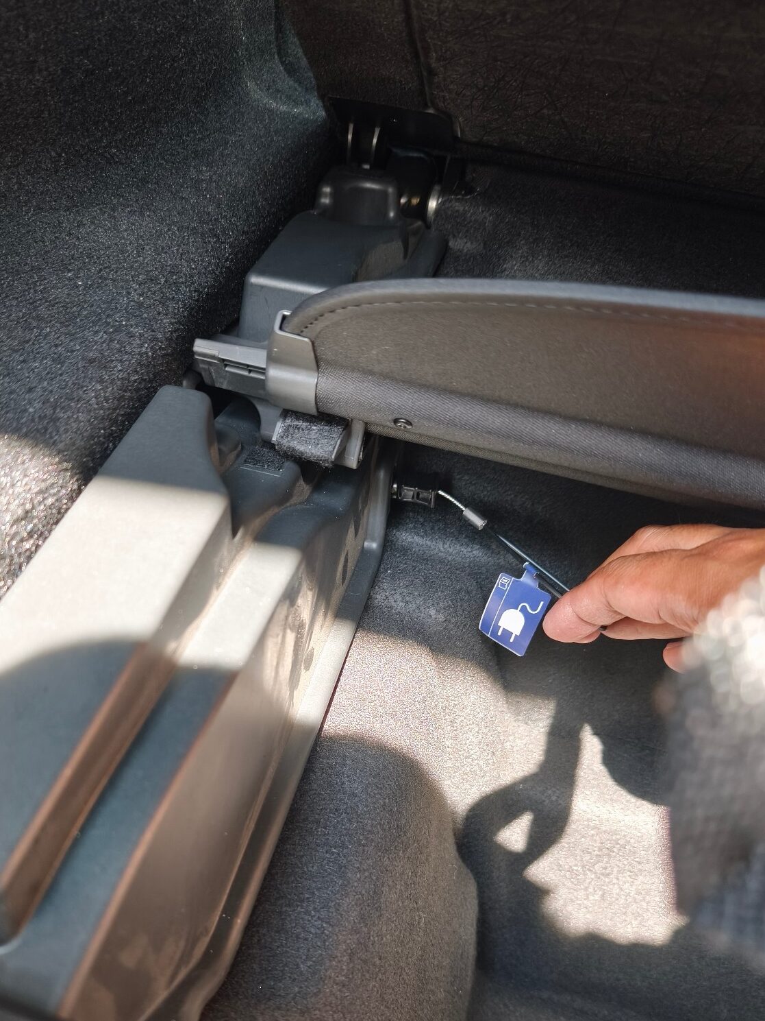 - วิธีการปลดล็อคสายชาร์จที่ติดค้าง ซึ่งมักจะมีตัวดึงบริเวณภายในรถ ด้านหลังตำแหน่งจุดชาร์จ