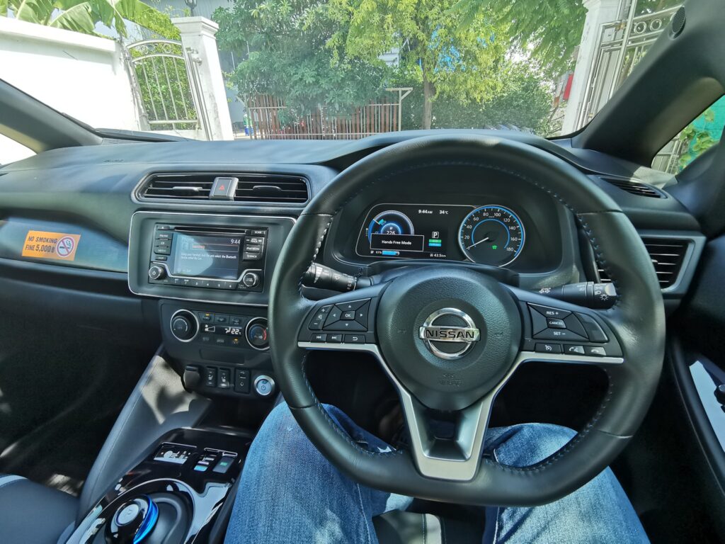 หากใครเคยขับ Suzuki swift ตัวปัจจุบันจะพบว่าตำแหน่งการวางสวิตซ์ต่างๆ แทบจะลอกข้อสอบกันไปมาเลยระหว่าง 2 ค่ายนี้ ทั้งวิธีการปรับและพับกระจกมองข้าง ตำแหน่งสวิตซ์แอร์ ลูกหมุนซ้ายเปิดแอร์กับปรับแรงลม ลูกขวาปรับอุณหภูมิ สวิตซ์ไฟฉุกเฉินก็อยู่กลางช่องแอร์กลางเหมือนกันอีก! เรียกว่าถ้าบ้านมีรถทั้ง 2 รุ่นนี้คือแทบไม่ต้องปรับตัวเลยหลับตาปรับสวิตซ์ยังได้ถ้าขับสลับคันกัน ส่วนออพชั่นภายในรถ ถ้าใครคิดว่า MG EP น้อยแล้วเจอคันนี้นี่ EP หลบไปเลย ของ EP ยังต่อมือถือขึ้นจอ Android Auto โชว์แผนที่ได้ซึ่งจำเป็นมากเวลาขับทางไกล กับมีระบบวัดลมยาง แต่ Leaf ไม่มีทั้งสองอย่าง! วิทยุเป็นวิทยุ CD หน้าตาเชยๆ ลูกเล่นไม่มาก มีช่องต่อ AUX, USB, Bluetooth แต่ Bluetooth ตอนต่อแรกๆ งงมาก เพราะต้องกดปุ่มรับสายบนพวงมาลัยด้วยตอนจับคู่อุปกรณ์ ตอนแรกจะกดที่ตัวเครื่องก็กดไม่ได้ ทำมางงมากแทนที่จะทำให้กดจากตัววิทยุหมดทุกอย่างได้ แล้วก็จอไม่มีระบบนำทาง มีจอสีเล็กๆ ไว้โชว์ภาพจากกล้อง 360 และกล้องถอย แต่ภาพจากกล้องแทบไม่ช่วยอะไรมากเท่าไร เพราะจอเล็กมองยาก จนบางทีไม่มองกล้องอาจจะถอยไวกว่า เวลาถอยหลังตัวรถมีเสียงเตือนภายนอกรถ ให้คนรู้ว่ารถกำลังถอยไม่ให้เงียบเกินไป อันนี้เป็นจุดที่น่าชมเชยเรื่องการเอาใจใส่ในรายละเอียด
